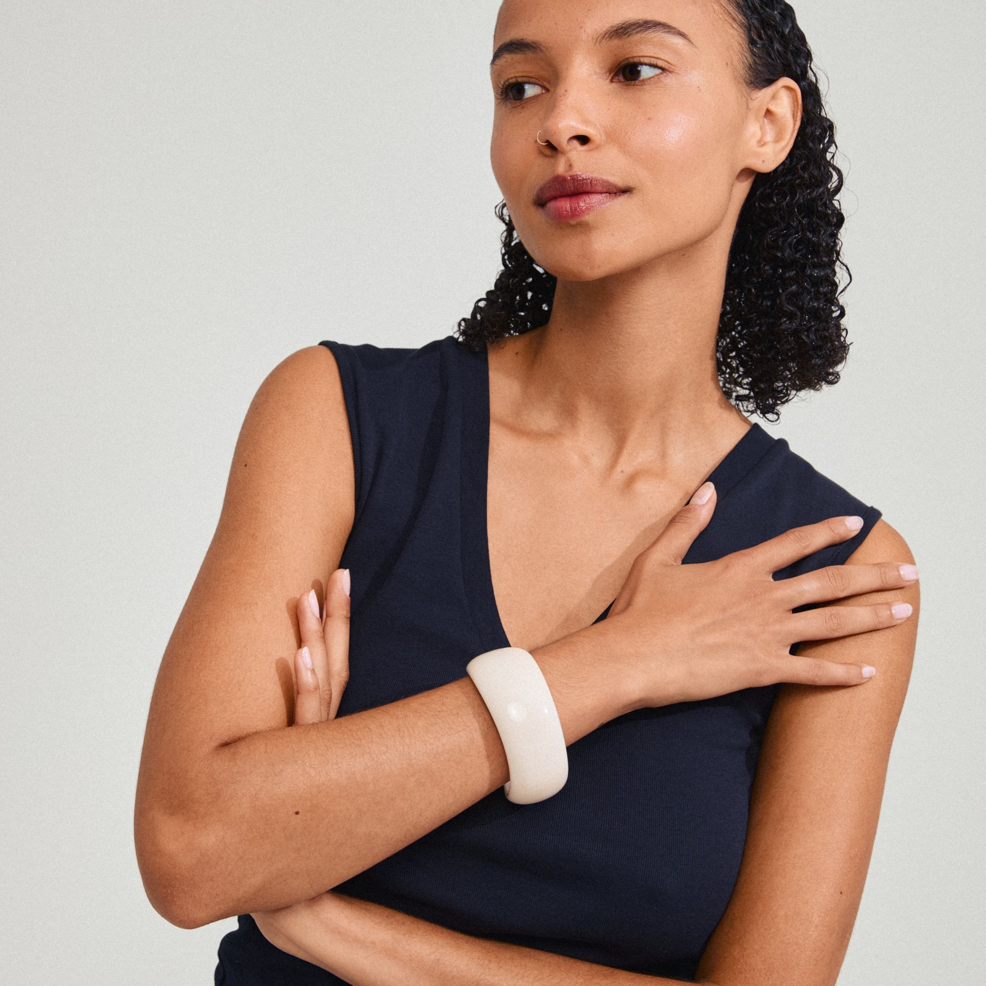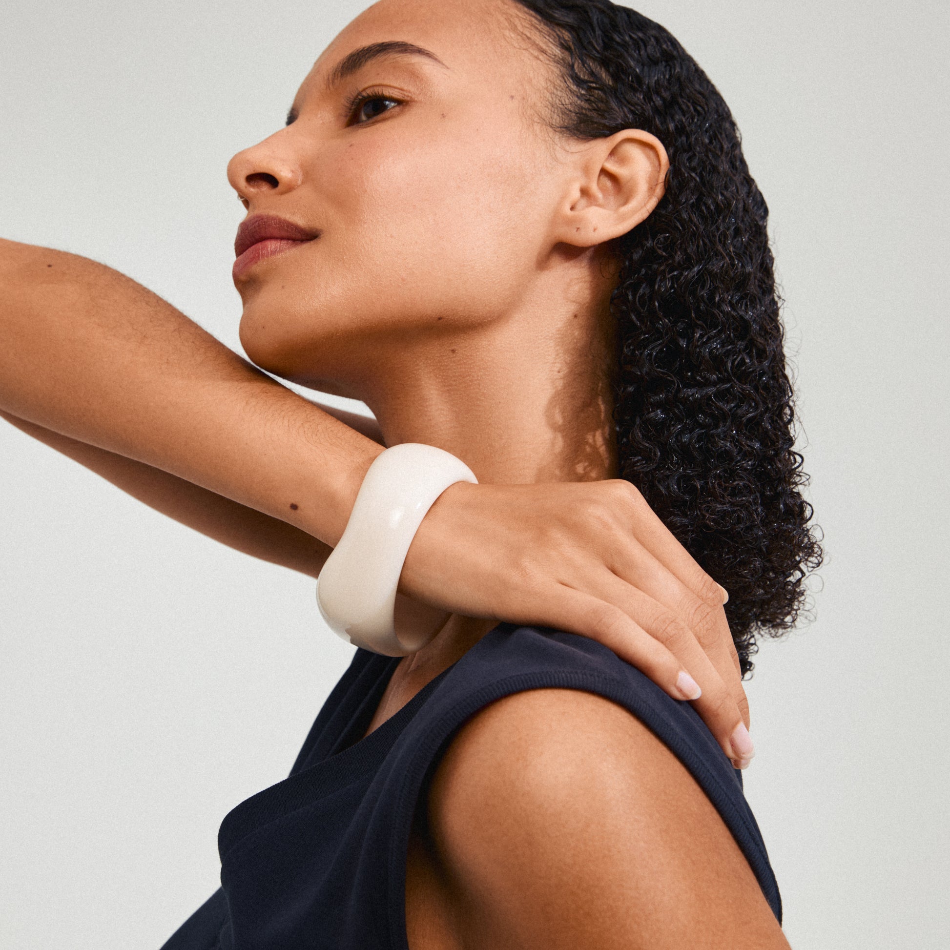 A dash of class! The AASE bracelet from Pilgrim is your new go-to fashion statement for summer outfits. This ivory chunky bangle, crafted from recycled acrylic, provides a trendy, earthy vibe and pairs effortlessly with multiple bracelets for a perfect stacked style. A summer essential for those who adore a simple, clean Scandi look. Style the bracelet with an oversized blazer and tailored shorts for a chic, minimalist look, or embrace a bold, maximalist approach by pairing with an array of colourful accessories for this year's major mix-and-match trend. Crafted from 99% recycled materials - it's fashion with a conscience.