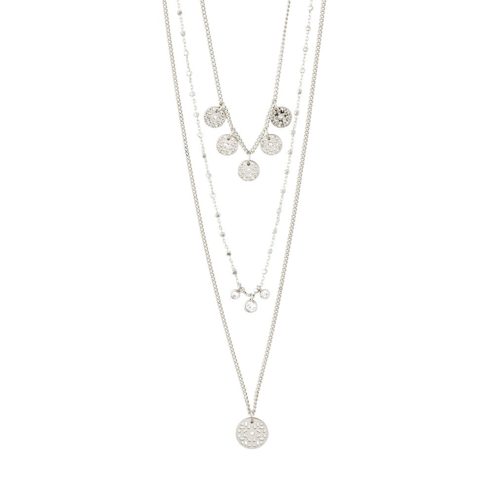With the silver-plated 3-in-1 necklace, you can create the perfect layered look. Style the 40, 48 and 50 cm long necklaces with your favourite basic item or your most beautiful dress. The chains' small coins and crystals work perfectly as a contrast to an edgy outfit. Let your femininity shine through with a bohemian look.