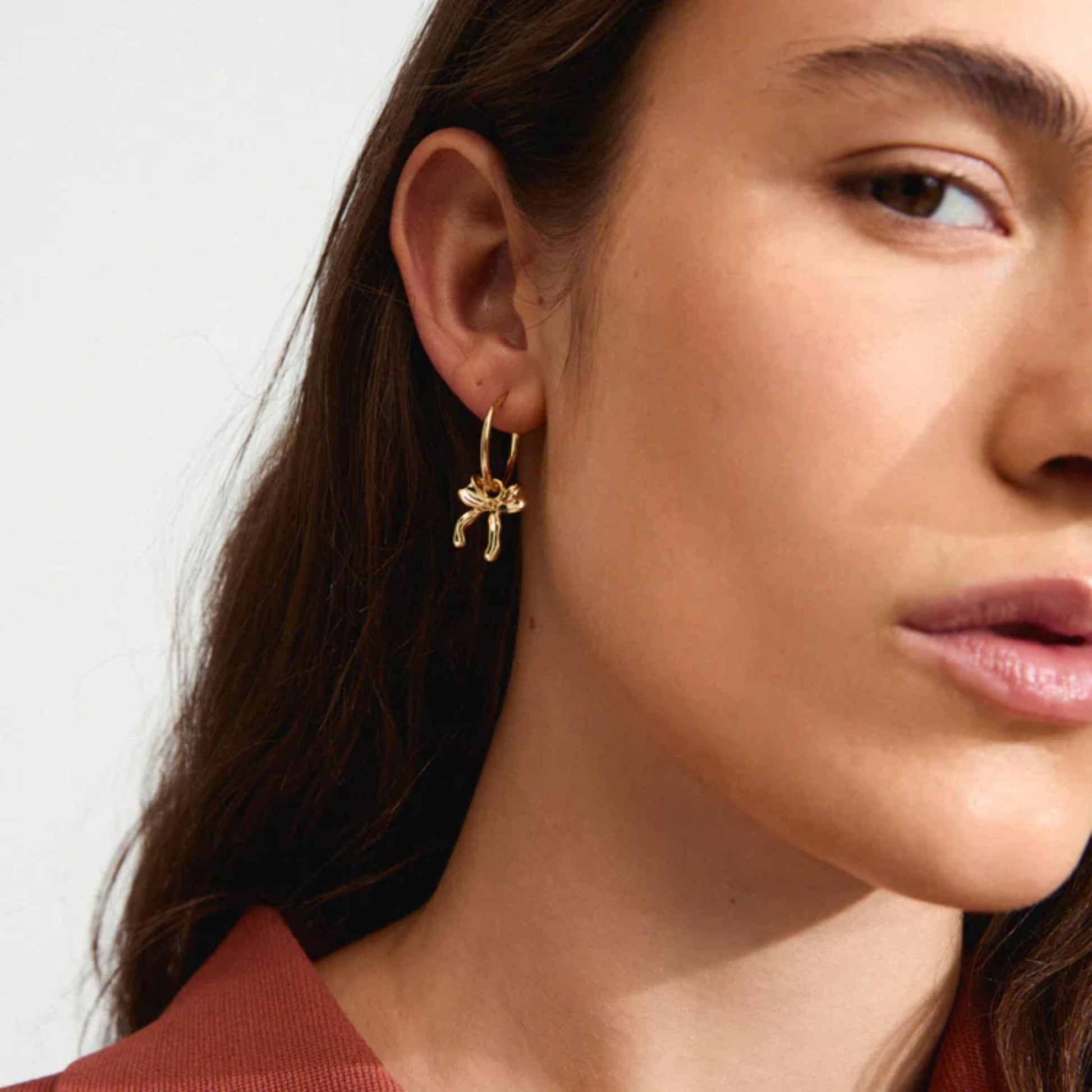 Tie your outfit together with a bow! Classic gold-plated hoops with trendy bow pendants - a key item you can't miss this season. Make the bow earrings your go-to accessory for everyday outfits and breezy summer dresses, adding the perfect touch to your summer look. The earrings have an easy-to-use click clasp for a light and effortless styling and are made from 99% recycled materials. A styling choice you can be proud of.