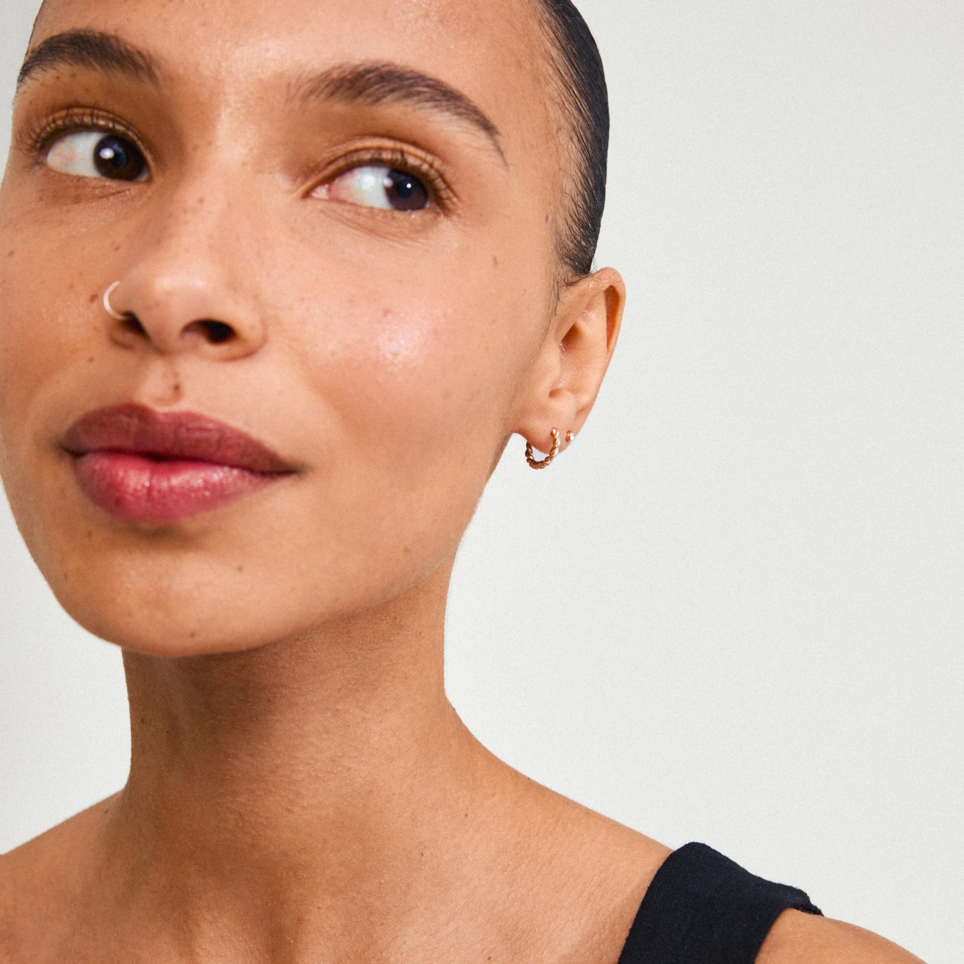 Classy, crystalline and cool! Set of three pairs of earrings, which can be used interchangeably as you like. Small, simple crystal studs add a bit of sparkle; the slightly larger gold-plated earrings have an organic handcrafted look, while the twirly huggie hoops add classiness and timeless vibes. Recycled items that are made from a min. of 75% recycled material.