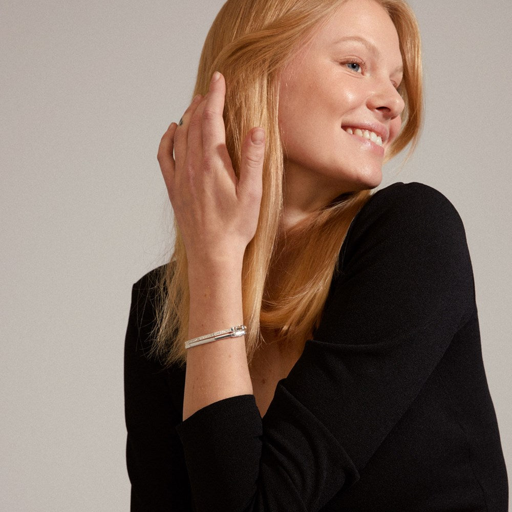 Show off your classy vibes with the 2 silver-plated bracelets designed in collaboration between Hanna Schönberg and Pilgrim. Angular polygon silhouettes and Preciosa crystals give an exclusive feel to the 2 bangles that you can effortlessly style with your favourite summer outfits. Go all in on a stacked look and add multiple chains and bracelets for the ultimate high-class look. The 2 bracelets are recycled pieces and are made from at least 75% recycled materials.