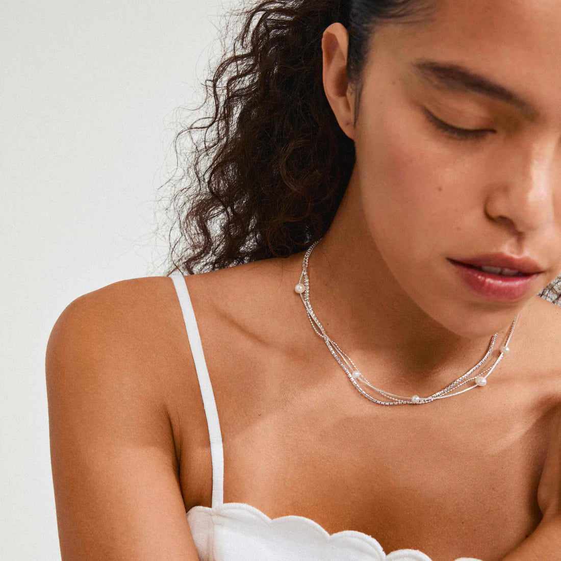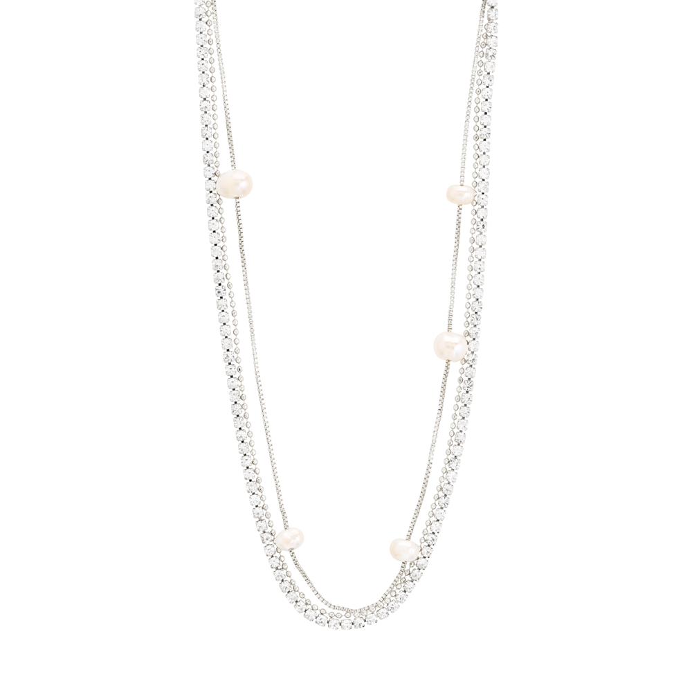 Feel the starlight glow with Pilgrim's STARLIGHT 3-in-1 necklace. This accessory is perfect for capturing the romance of summer. A delightful layered mix of silver-plated chains including an elegant bead chain, a crystal chain, and a slim box chain with genuine freshwater pearls. Pair with a flowy summer dress or simple tank top for a dreamy look with sweet summer vibes. The chain measures 38 cm + 9 cm extension chain.